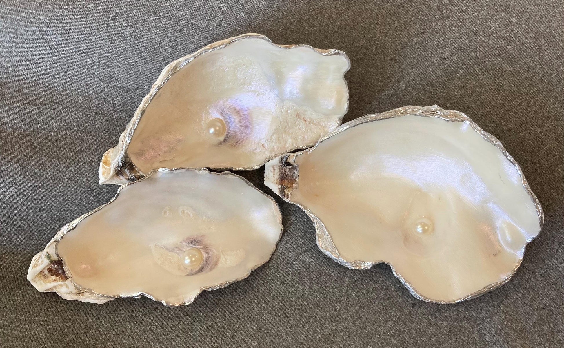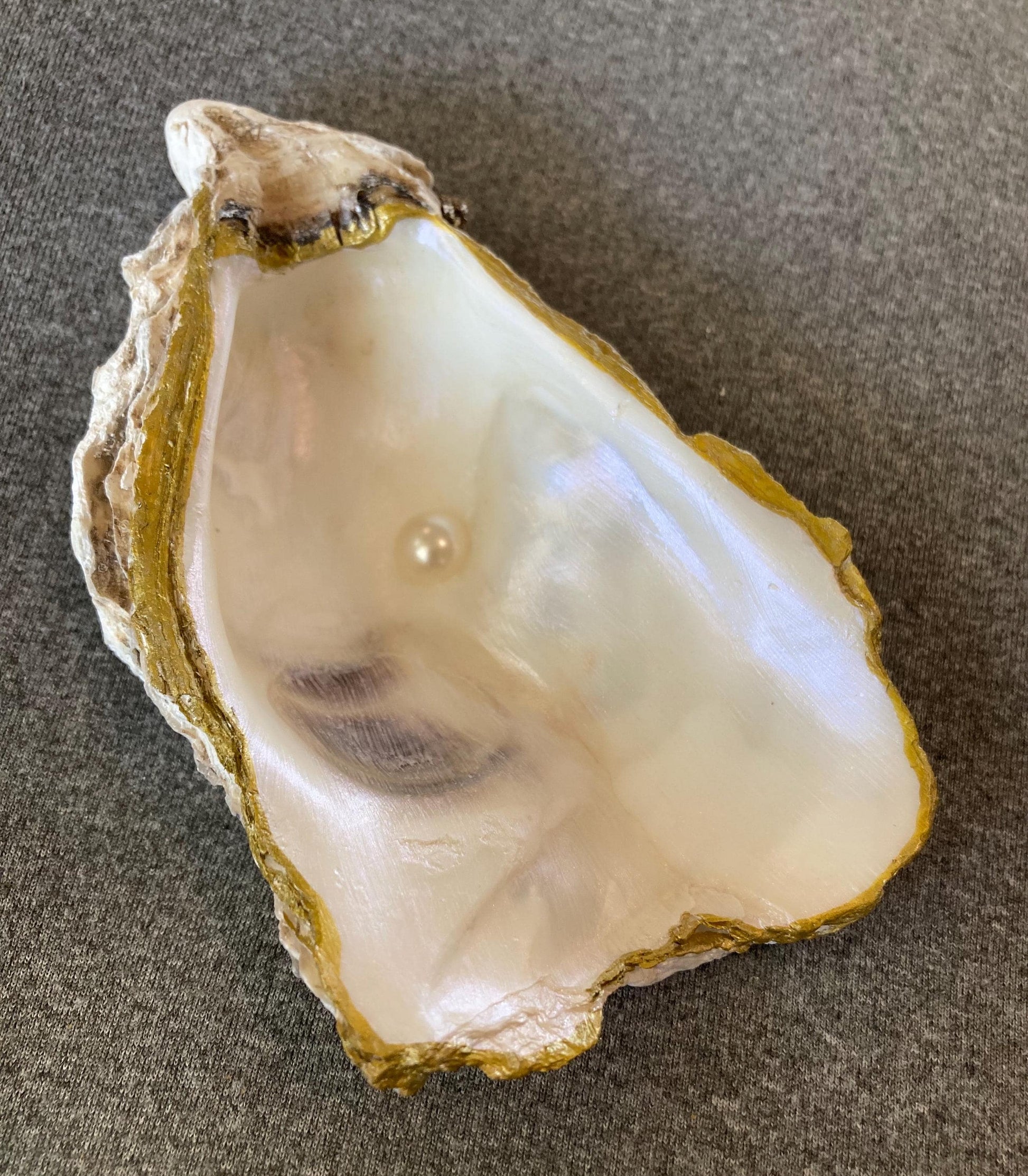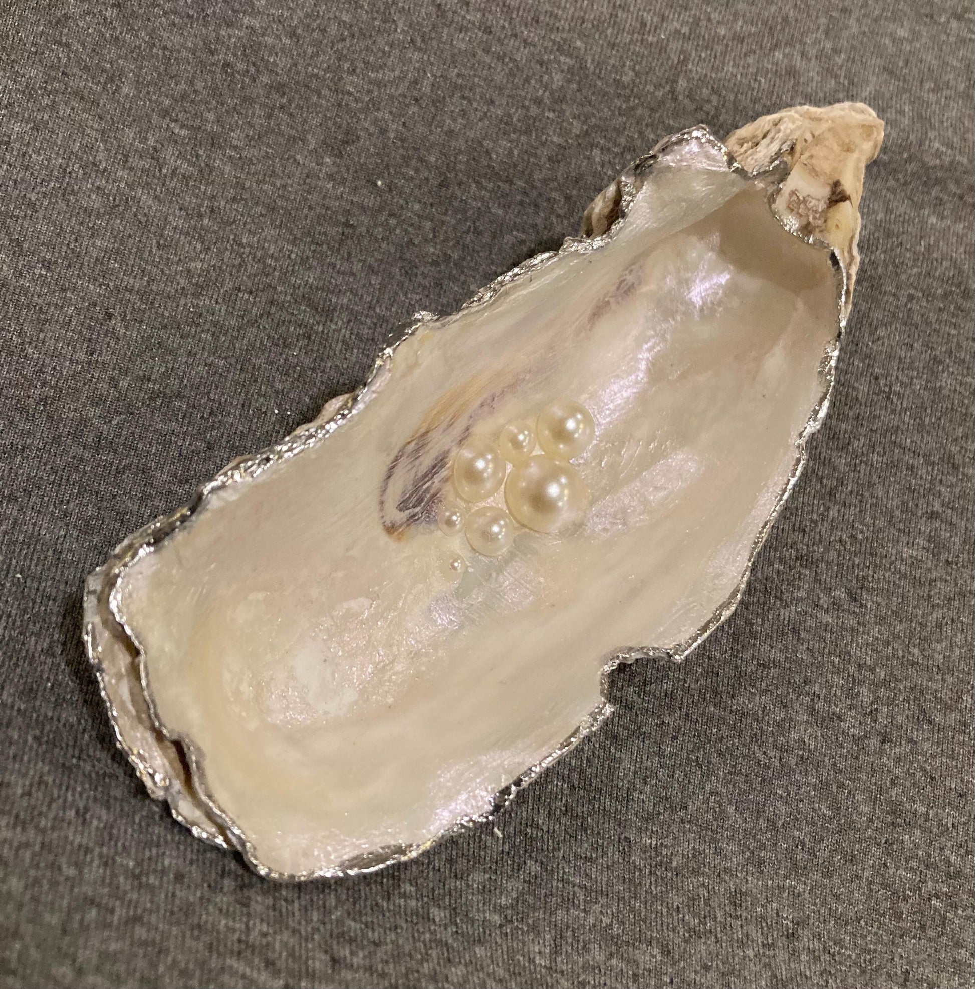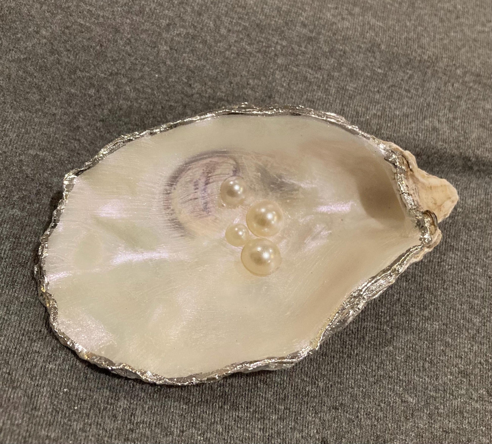 Our beautiful oyster ring dishes are sure to please her. Oysters vary in size, according to how God chose to make them, but range between 4-5” in length. Each one cradles a beautiful authentic pearl and is unique, just like her. Choose from gold or silver trim. Ships quickly.