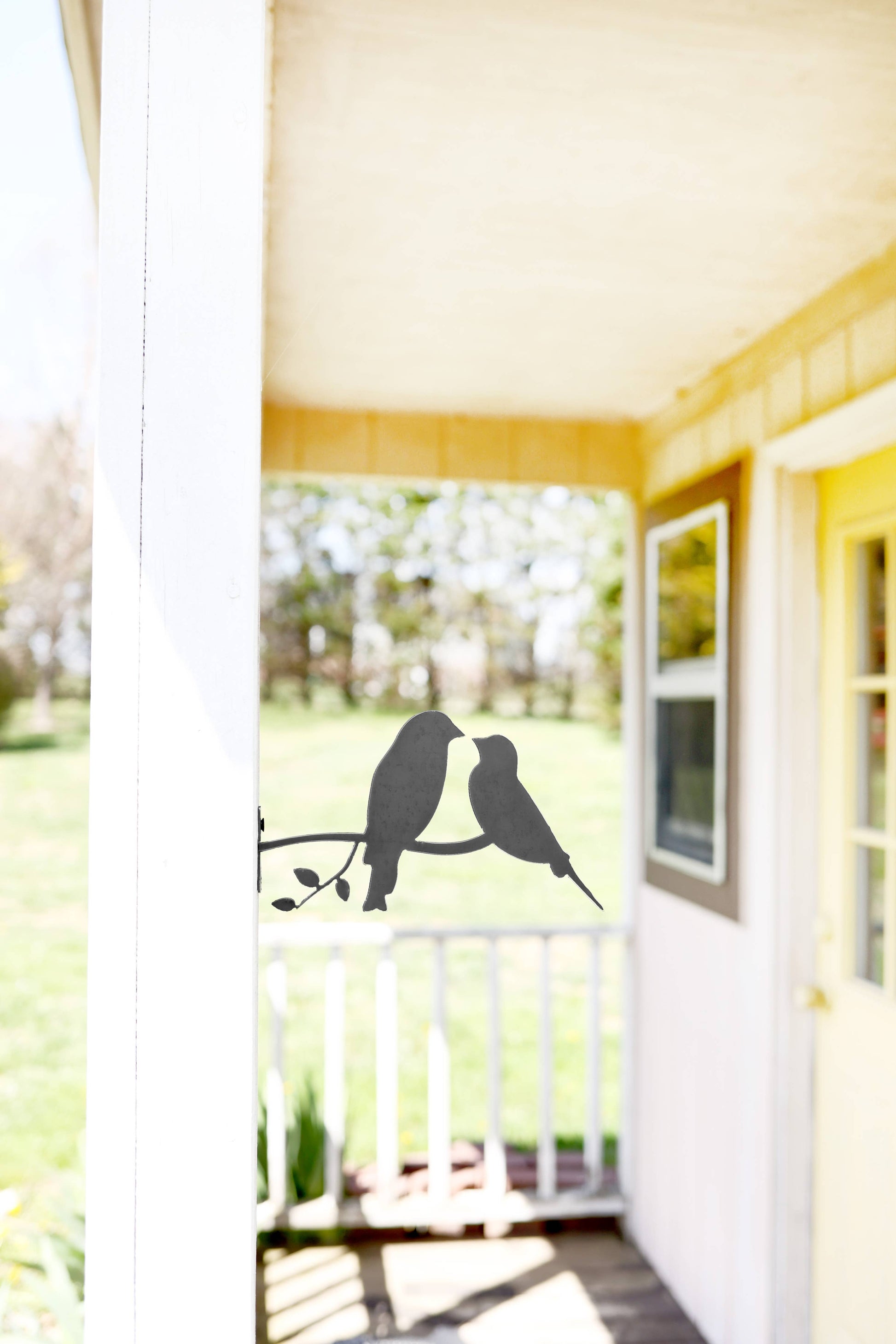 Cheer up your front porch, garden, or any interior post with our cheerful metal love birds decoration. Simply use the screws that are included to attach these sweet birdies to your decking, a fence post or other interior wall, post, or fixture. Measures 5" x 8 1/2". Your item is plasma cut using 16 gauge steel for a durable, yet lightweight piece. The metal is left untreated to maintain its natural finish, so it will slowly rust and patina over time if installed outdoors.